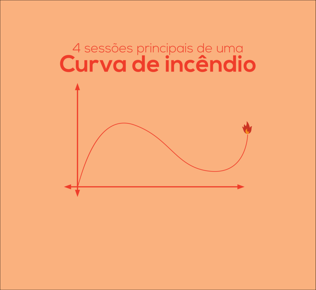 As 4 sessões principais de uma curva de incêndio.O Design da Curva de incêndio é uma descrição do desenvolvimento de um incêndio para um determinado conjunto de condições. É, normalmente, descrita em TAXA DE CALOR LIBERADO x TEMPO, mas, pode ser descrita também de outras maneiras, como por exemplo: um conjunto de probabilidades, temperaturas ou produção de fumaça/gases tóxicos. Os parâmetros da curva serão descidos de acordo com o tipo de análise utilizada. nPara a maioria dos incêndios, o des